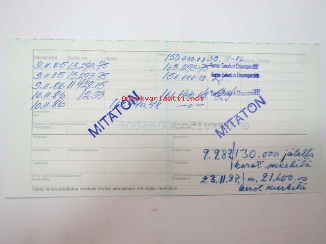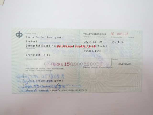 Talletustodistus, Turun Seudun Osuuspankki, määräaikaistalletus 24 kk, 150 000 mk, 9.11.1984