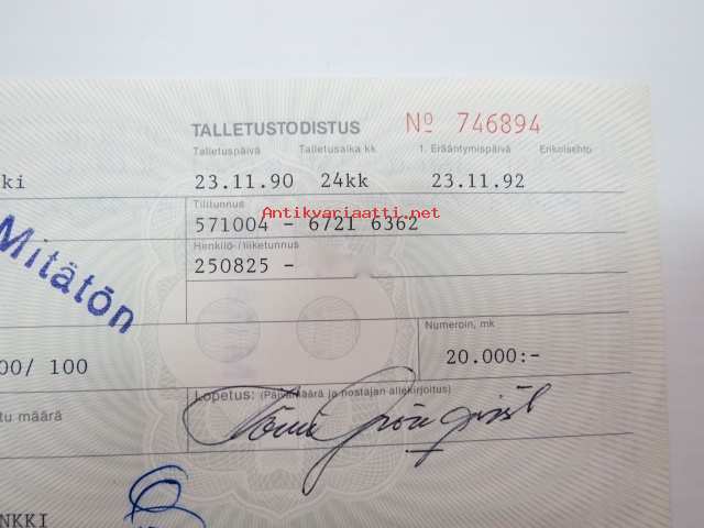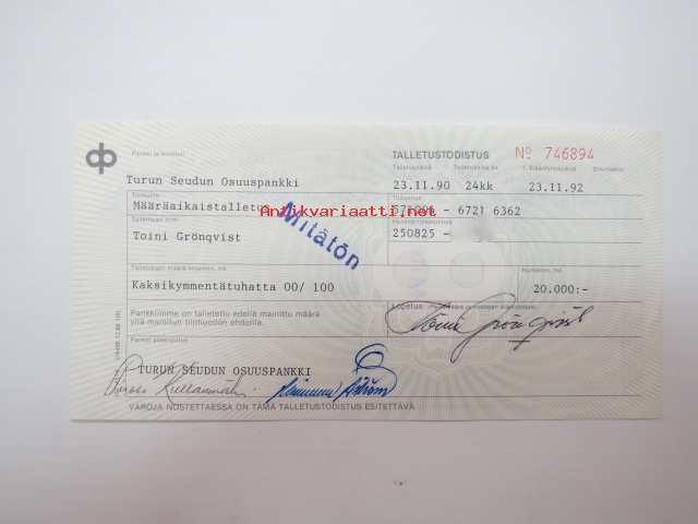 Talletustodistus, Turun Seudun Osuuspankki, määräaikaistalletus 24 kk, 20 000 mk, 23.11.1992