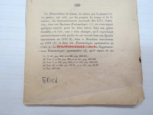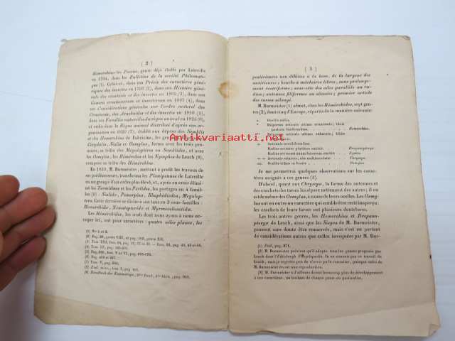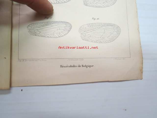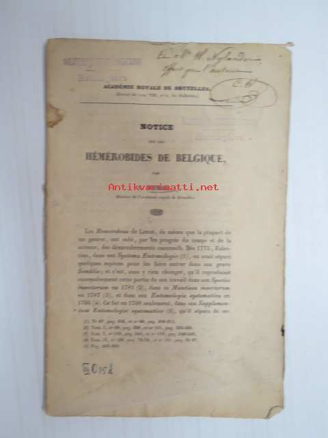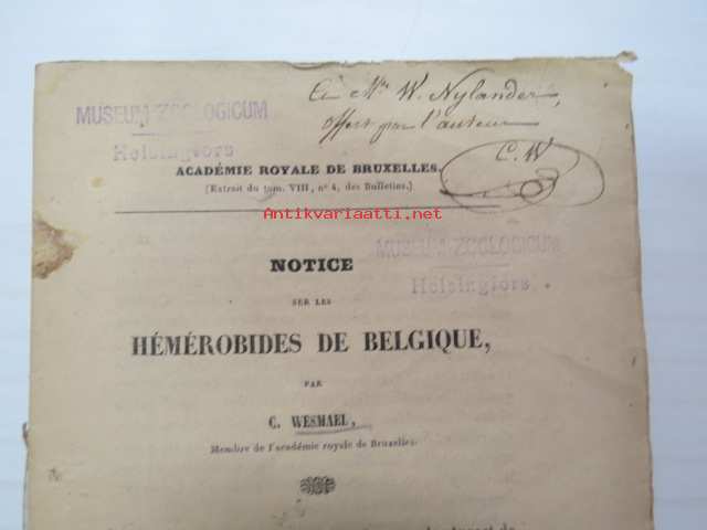 Notice sur les Hémérobides de Belqique, par C. Wesmael, tieteellinen tutkielma, eripainos, 1 kuvataulu, tekijän omakätinen omiste W. Nylanderille
