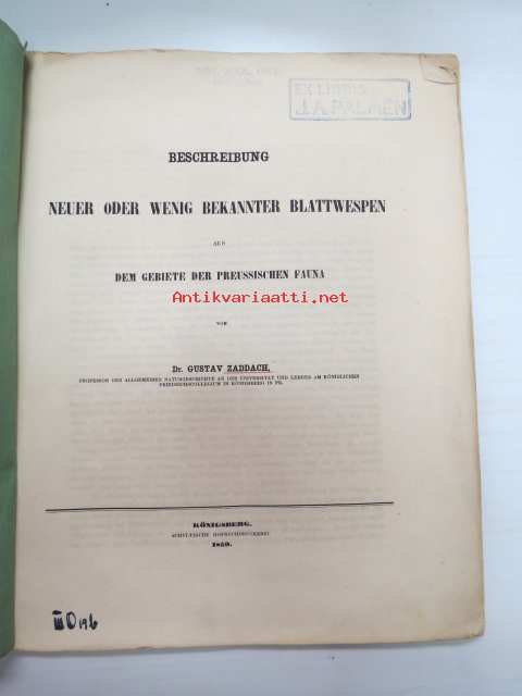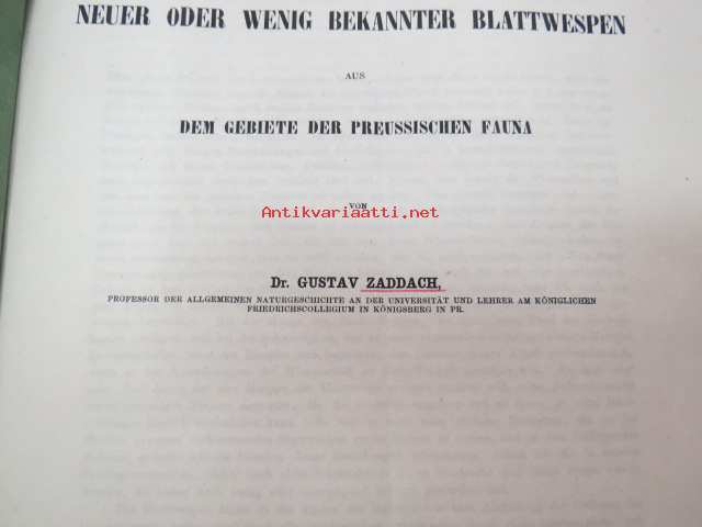 Beschreibung Neuer oder Wenig Bekannter Blattwespen aus dem Gebiete der Preussischen Fauna von Dr. Gustav Zaddach, Königsberg, 1859 -tieteellinen tutkielma, 1