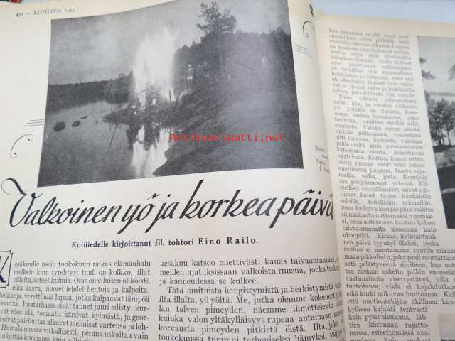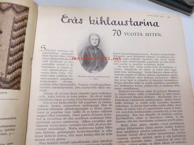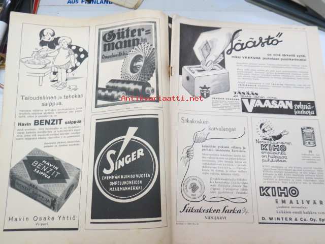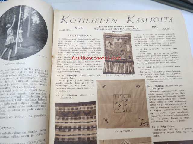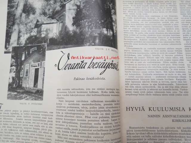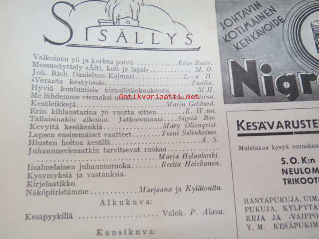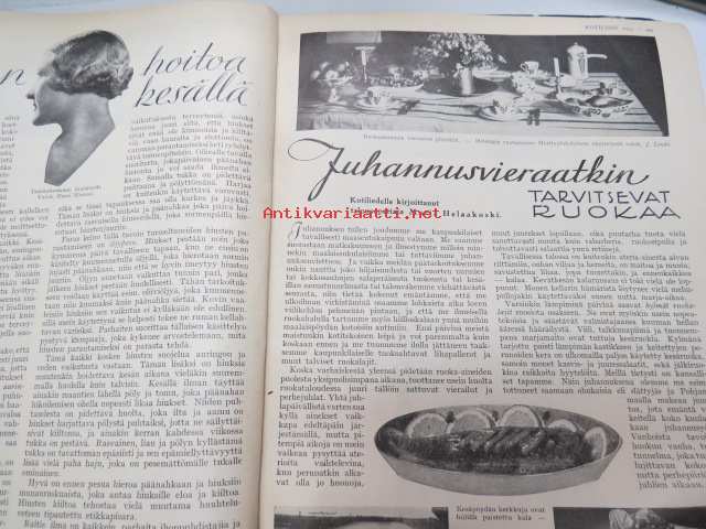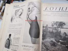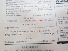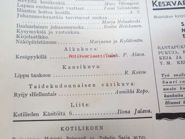 Kotiliesi 1933 nr 12, ilmestynyt 15.6.1933, kesäkuu II - Juhannusnumero, sis. mm. seur. artikkelit / kuvat / mainokset; Kansikuvitus Rudolf Koivu, Havi Benzit saippua, Siikakaosken Sarka Oy - karvalangat, Kiho emaliväri, Kodak Six kamera, Silo uimapuku, Suomen messut - koti, äiti, lapset, Vieraita kesäyössä - pakinaa kesäkodeista, Hyviä kuulumisia kirkolliskokouksesta - nainen äänivaltaiseksi, Me lähdemme vieraaksi maalle, Kotileiden käsitöitä liite mukana, Kevyitä kesäkenkiä, Lapsen ensimmäiset vaatteet, Hiusten hoitoa kesällä, juhannusvieraatkin tarvisevat ruokaa, Iisalmelainen juhannusruoka - muurinpohjaletut, ym.21 x 28 cm.