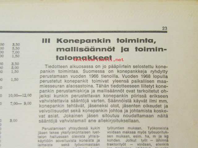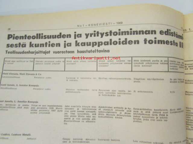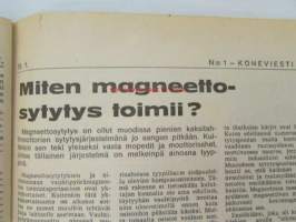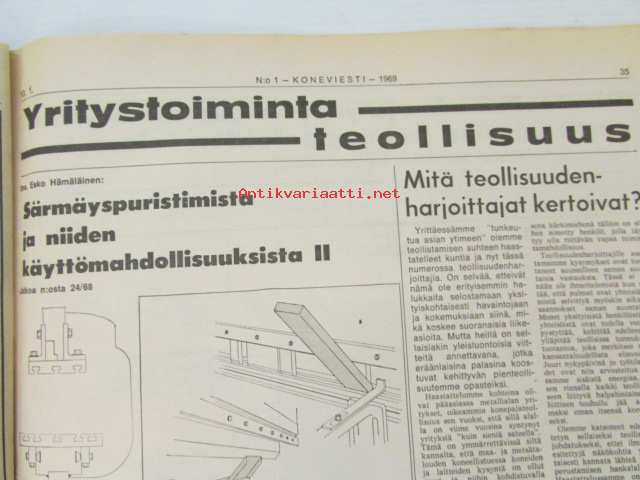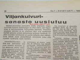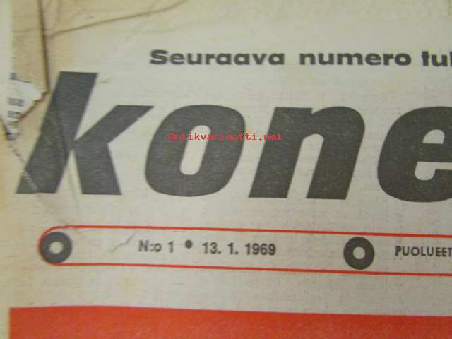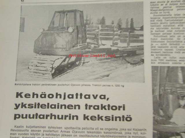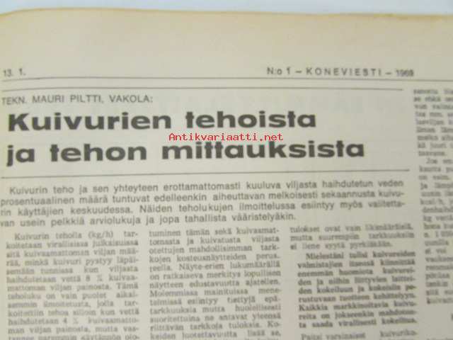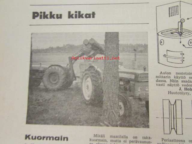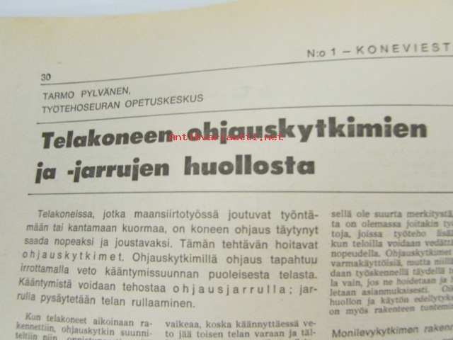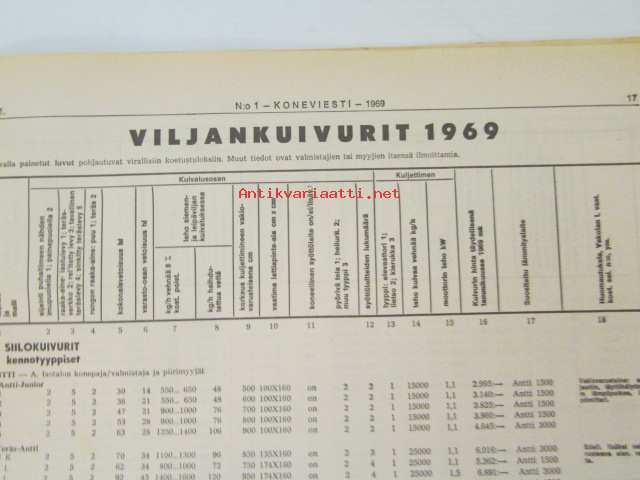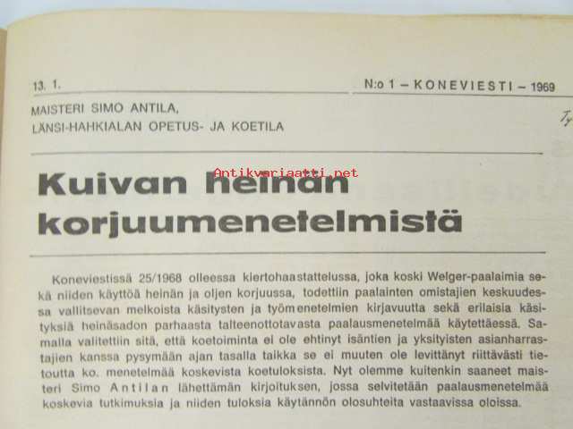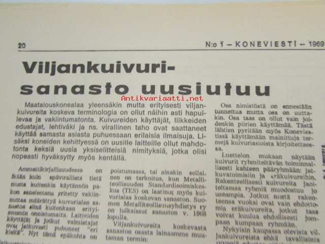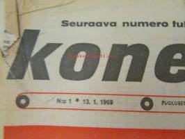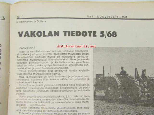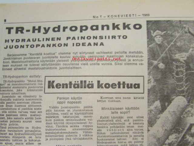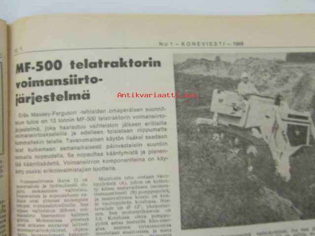 Maaseudun Ammattilehti Oy, 1969Koneviesti 1969 nr 1, sis. mm. seur. artikkelit / kuvat / mainokset; Kotimainen monitoimikone Pika-50 karsii ja katkoo, TR-Hydropankko - Hydraulinen painonsiirto juontopankon ideana, Vuoden kone - Etujakajalla varustettu Marttiinin metsänparannusaura, Kehäohjattava yksitelainen traktori, Stilh kuorimakone, Viljakuivurit ja Viljankuivureiden lämmityslaitteet 1969 Tekniset tiedot, MF-500 Telatraktorin voimansiirtojärjestelmä, katso tarkemmin sisältöä kuvista.