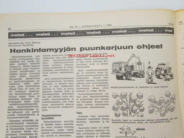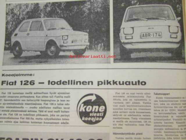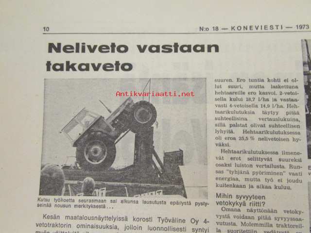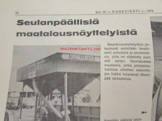 Maaseudun Ammattilehti Oy, 1973Koneviesti 1973 nr 18, sis. mm. seur. artikkelit / kuvat / mainokset; Fiat 126 - Todellinen pikkuauto, Multausvaunu pelolla - Saparo-vaunu - Tive-Lietevaunu - Terästakomon lietevaunu - Sake-vaunu - Li-Mu 6 vaunu - Vakolan lietevaunu, Toyota Mark II Deluxe, Volvon Kurma-autot N7 - N10 - N12, Moottorisahat 1973 tekniset tiedot, Atlas Corpo 100 vuotta, katso sisältöä kuvista tarkemmin.