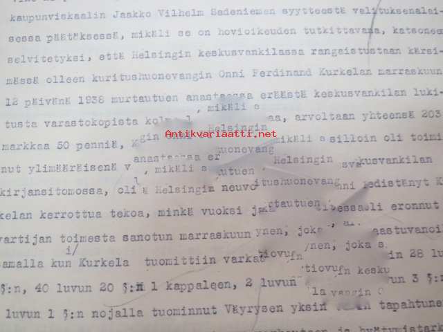 Turun Hovioikeuden päätös Helsingin keskusvankilassa tapahtuneeseen 3 lampaannahan varkauteen varastokopista, johon on kuritushuonevangin O.F.K:n lisäksi