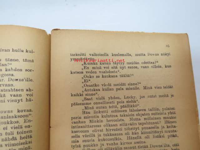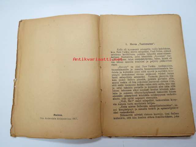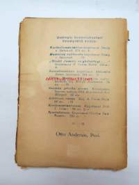 | Saatavilla | 1 kpl | | Julkaisuvuosi | 1917 | | Sivuja | 96 | | Painos | 1. | | Kunto | K2 | | Kulunut, kannet hauraat | | Sidonta/painoasu | Nidottu (pehmeäk.) | | Kielet | Suomi |