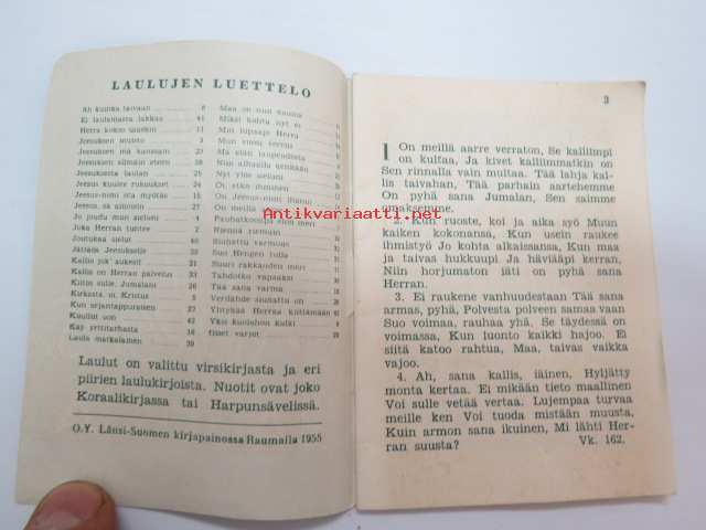 | Saatavilla | 1 kpl | | Julkaisuvuosi | 1955 | | Sivuja | 32 | | Kunto | K3 | | Sidonta/painoasu | Nidottu (pehmeäk.) | | Kielet | Suomi |