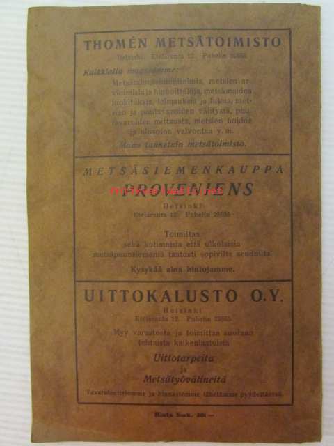 | Saatavilla | 1 kpl | | Julkaisuvuosi | 1929 | | Sivuja | 66 | | Kunto | K2 | | Ensimmäiseltä sivulta on pieni pala pois | | Sidonta/painoasu | Nidottu (pehmeäk.) | | Kielet | Suomi |