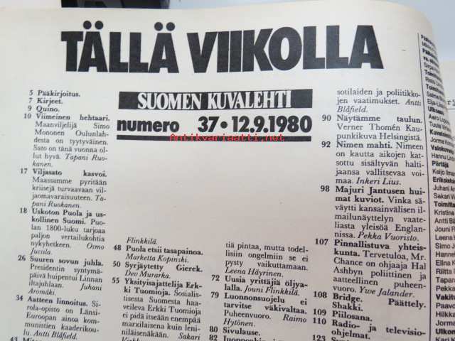Suomen Kuvalehti 1980 nr 37, sis. mm. seur. artikkelit / kuvat / mainokset; Kansikuva sotilaslentäjä majuri Paavo Janhunen, Tervetuloa keskiasteelle, Viljanpuintia Tapanilan tilalla - Oulunlahti - Simo Mononen,UKK 80-vuotisjuhla, Sirola-opisto on luja aatteen linnoitus, MTV-Uutiset aloittaa, Yksityisajattelija Erkki Tuomioja, Emil Cedercreutzin museo, ym.
