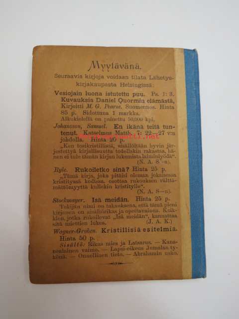 | Saatavilla | 1 kpl | | Julkaisuvuosi | 1890 | | Sivuja | 94 | | Painos | 1. | | Kunto | K2 | | Sidonta/painoasu | Sidottu (kovak.) | | Kielet | Suomi |