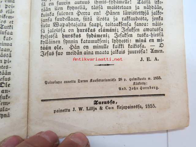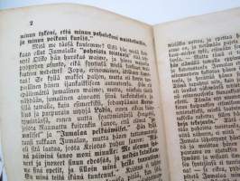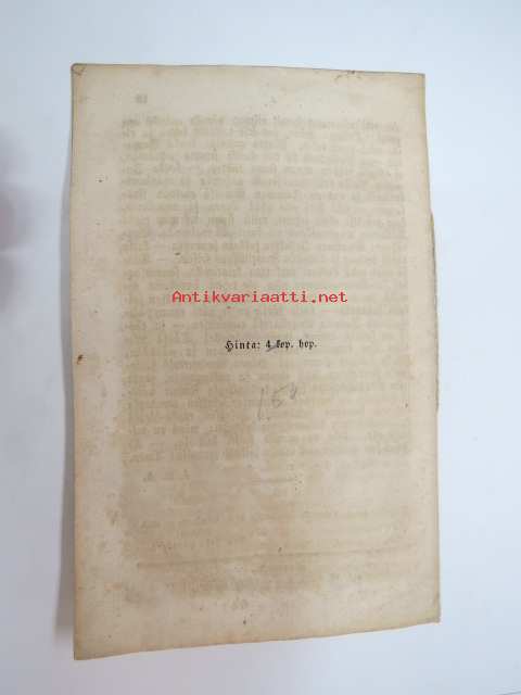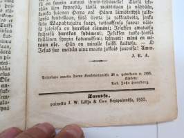 | Saatavilla | 1 kpl | | Julkaisuvuosi | 1855 | | Sivuja | 15 | | Painos | 1. | | Kunto | K3 | | Sidonta/painoasu | Vihko | | Kielet | Suomi |