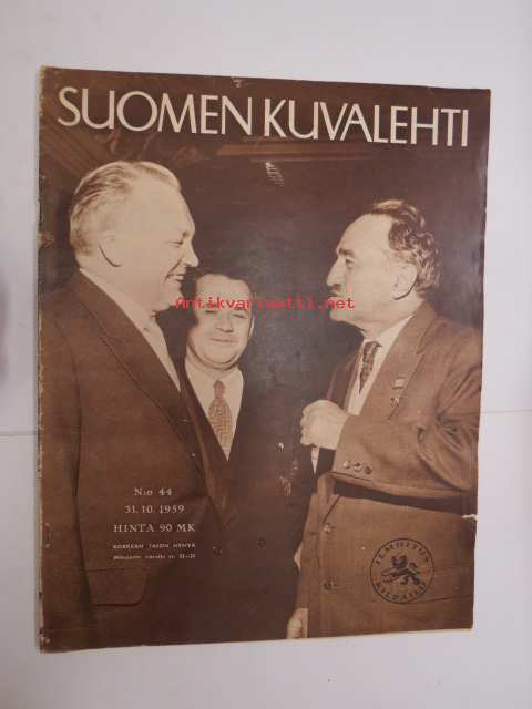 Suomen Kuvalehti 1959 nr 44, ilmestynyt 31.10.1959, sis. mm. seur. artikkelit / kuvat / mainokset; Kansikuva Anastas Mikojan, Klubi 7, SOK Kutaleima jauhot, Shell