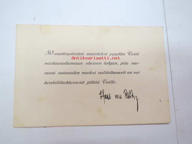 Hans von Rettig 50-vuotta 2.12.1944 - kiitoslahjan kortti, painetulla nimikirjoituksella