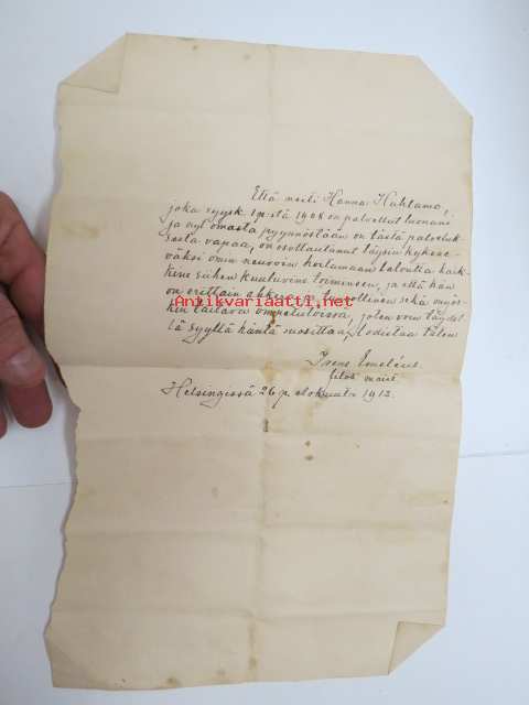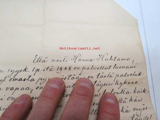 Että neiti Hanna Huhtamo, joka syyskuun 1 p:stä 1908 on palvellut luonani... todistan täten - Irene Eméleus, filosofian maisteri, Helsinki 26.8.1912 -work certificate for servant