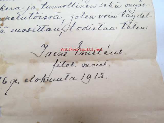 Että neiti Hanna Huhtamo, joka syyskuun 1 p:stä 1908 on palvellut luonani... todistan täten - Irene Eméleus, filosofian maisteri, Helsinki 26.8.1912 -work