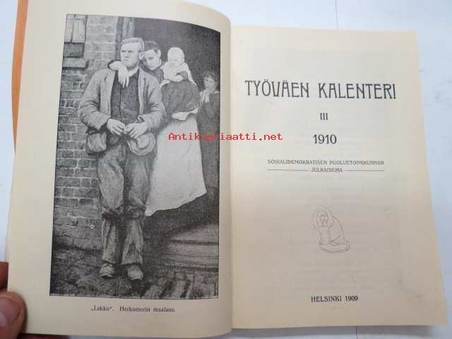 Työväen Kalenteri III (3.) 1910, sis. mm. seur. artikkelit; Kansikuvitus Sallinen, Kalenteritietoja, Markkinapäivät, Tietoja posti- ja rautatielähetyksistä, Y. sirola - Haluatko kunnon puhujaksi?, Väinö Hakkila - 25 vuotta Suomen työväenliikettä, Helsingin muurarien soittokunta, A.B. Mäkelä - Miksi Malkosaaren (Malkosaari) yhtiöhomma ei menestynyt, Leipurilakitaistelu Suomessa, Työväen apukassat, Kehitysoppi ja Darwin, A. Morosoff - Venäjän valtiotalous, E. Gylling - Katsaus torpparilaitoksen kehitykseen Suomessa, Eduskuntavaalit 1909, Tietoja maanvuokraajille, ym. -calendar