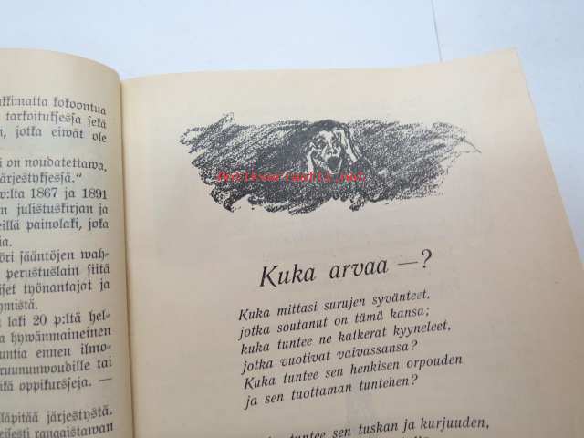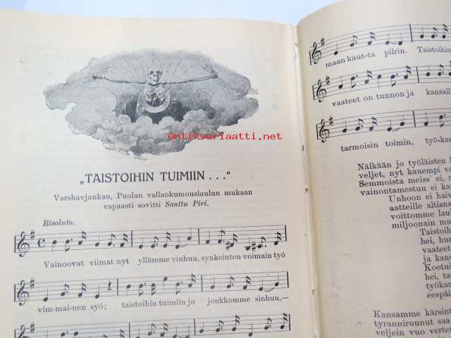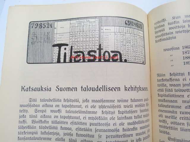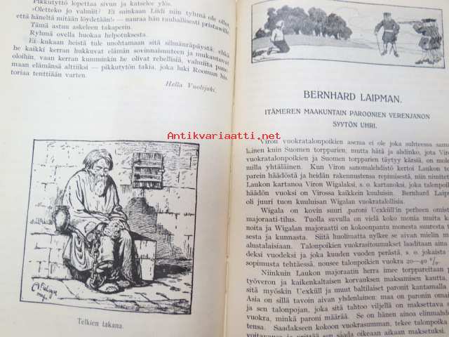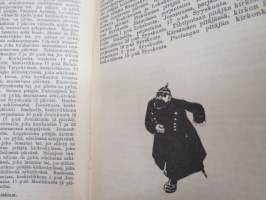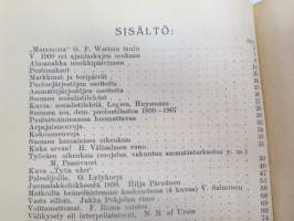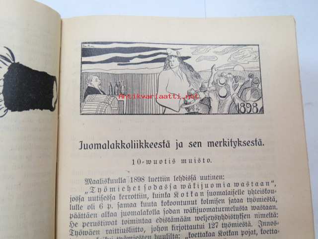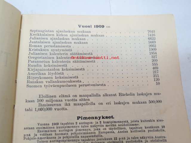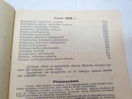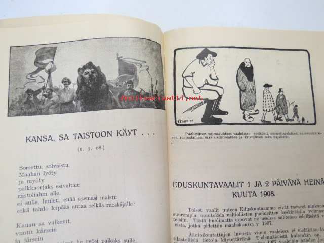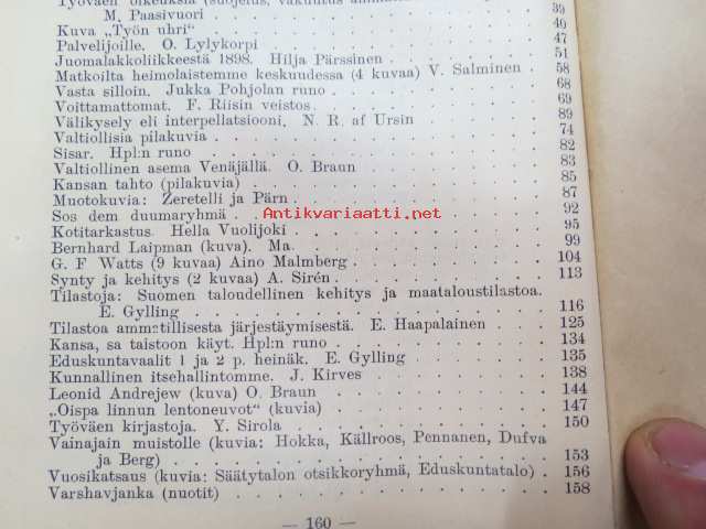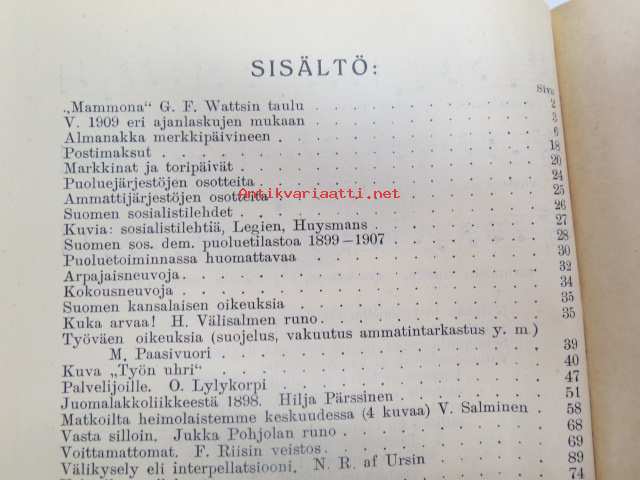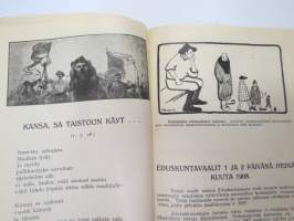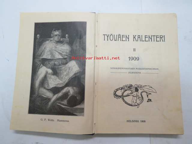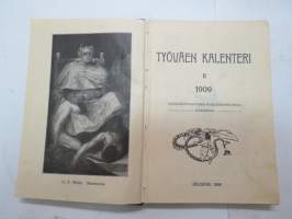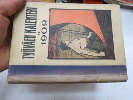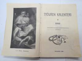 Työväen Kalenteri II (3.) 1909, sis. mm. seur. artikkelit / kuvat / mainokset; Kalenteritietoja, Markkinapäivät, Tietoja posti- ja rautatielähetyksistä, Suomen sosialistilehdet, Arpajaisneuvoja, Kokousneuvoja, Suomen kansalaisen oikeuksia, M. Paasivuori - työväen oikeuksia, N.R. af Ursin - Välikysely eli interpellatsiooni, Hilja Pärssinen - Juomalakkoliikkeestä 1898, E. Haapalainen - tilastoa ammatillisesta järjestäytymisestä, J. Kirves - Kunnallinen itsehallintomme, ym. -calendar