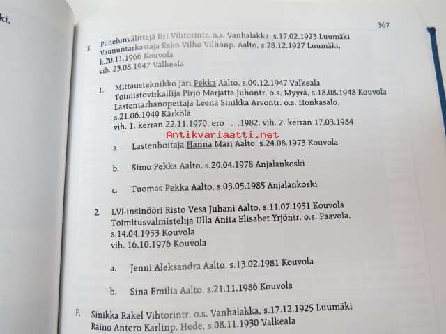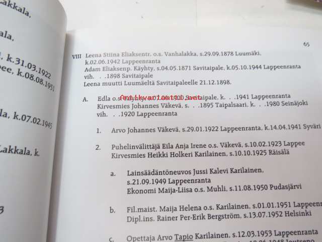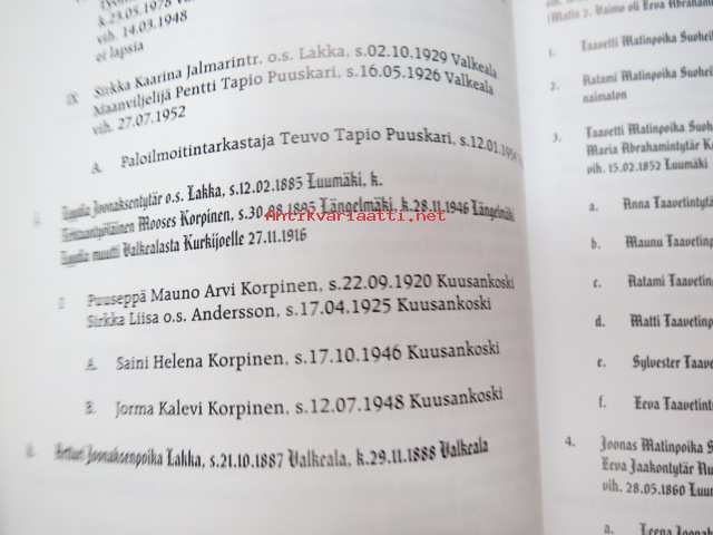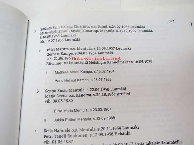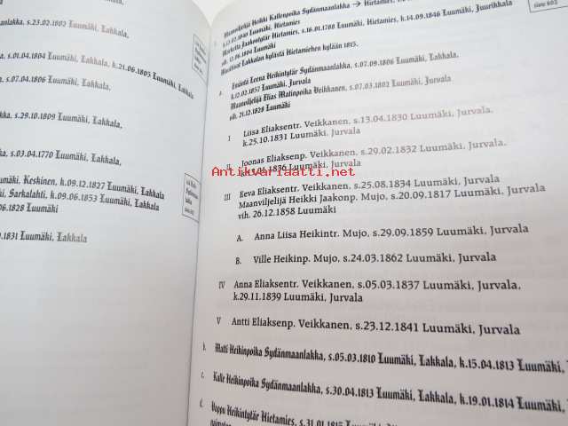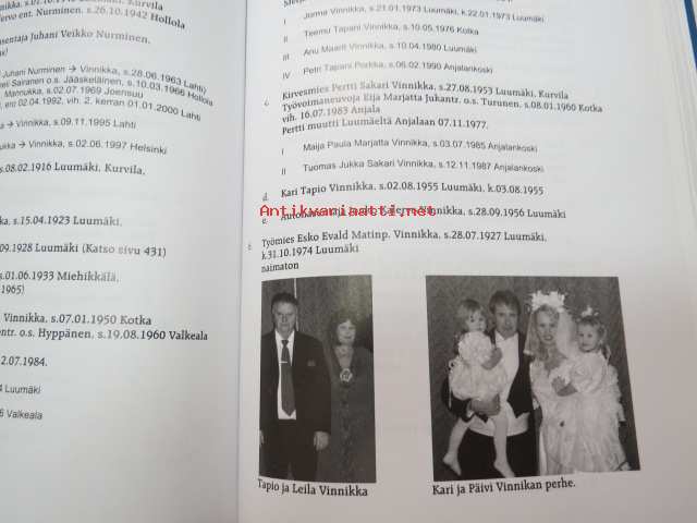 | Saatavilla | 1 kpl | | Julkaisuvuosi | 2001 | | Sivuja | 816 | | Painos | 1. | | Kunto | K2 | | Käytön jälkiä | | Sidonta/painoasu | Sidottu (kovak.) | | ISBN | 951-98707-0-9 | | Kielet | Suomi |