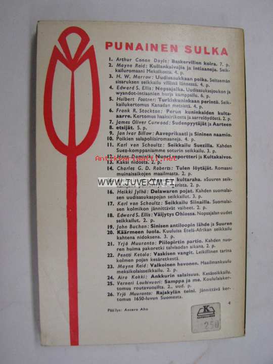 | Saatavilla | 1 kpl | | Julkaisuvuosi | 1968 | | Sivuja | 146 | | Painos | 2. | | Kunto | K3 | | Sidonta/painoasu | Nidottu (pehmeäk.) | | Kielet | Suomi |