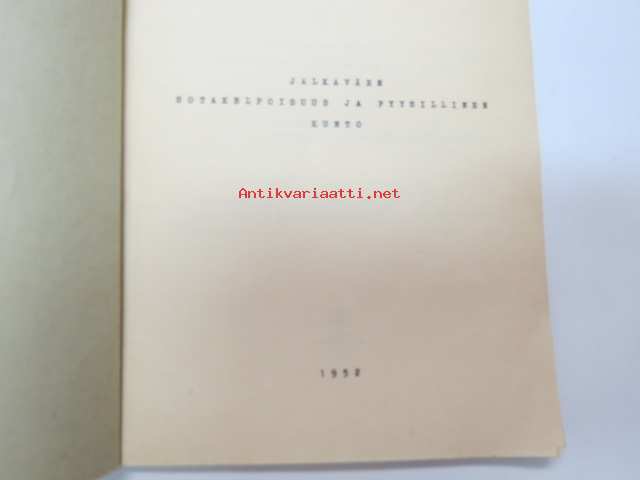 | Saatavilla | 1 kpl | | Julkaisuvuosi | 1952 | | Sivuja | 81 | | Painos | 1. | | Kunto | K2 | | Sidonta/painoasu | Nidottu (pehmeäk.) | | Kielet | Suomi |
