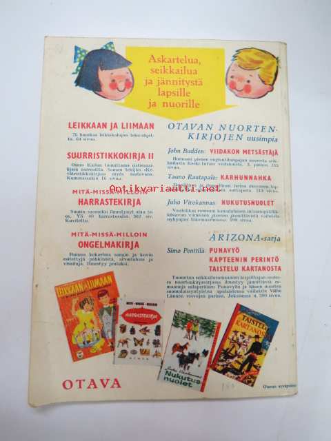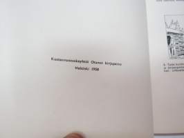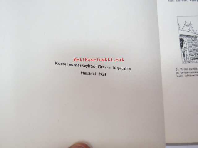 | Saatavilla | 1 kpl | | Julkaisuvuosi | 1958 | | Sivuja | 46 | | Painos | 1. | | Kunto | K2 | | Sidonta/painoasu | Nidottu (pehmeäk.) | | Kielet | Suomi |