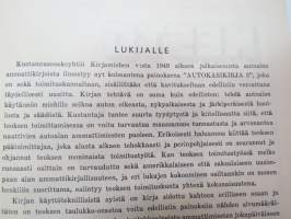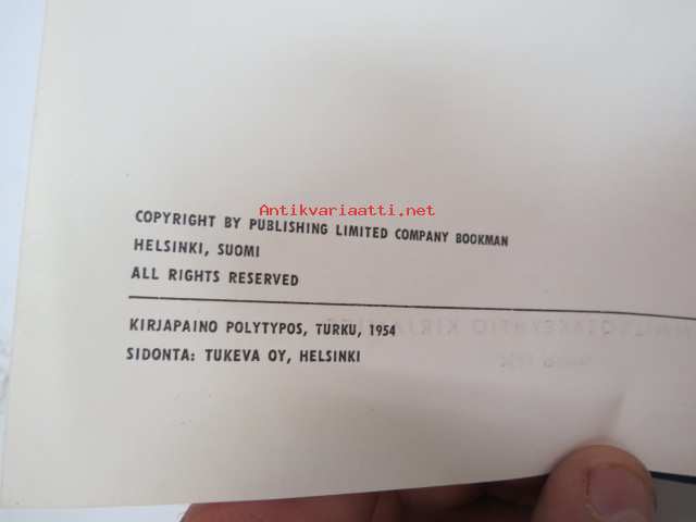 | Saatavilla | 1 kpl | | Julkaisuvuosi | 1954 | | Sivuja | 1040 | | Painos | 1. | | Kunto | K2 | | Kulunut | | Sidonta/painoasu | Sidottu (kovak.) | | Kielet | Suomi |