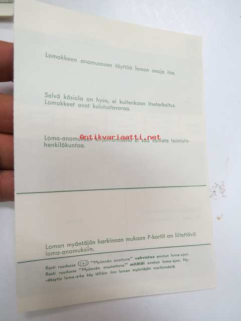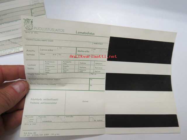 SA / Puolustuslaitos Loma-anomuskaavake SA Knto 30 11 61, käyttämätön lomake 60-luvulta -army sheet for leave application, unused, 1960´s