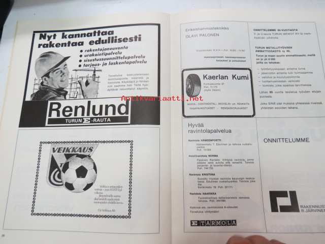 | Saatavilla | 1 kpl | | Julkaisuvuosi | 1972 | | Sivuja | 36 | | Painos | 1. | | Kunto | K2 | | Sidonta/painoasu | Nidottu (pehmeäk.) | | Kielet | Suomi |