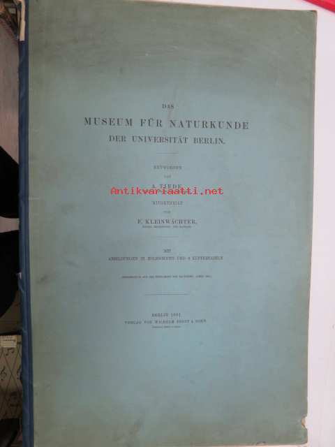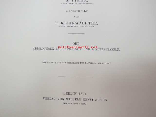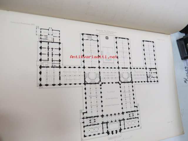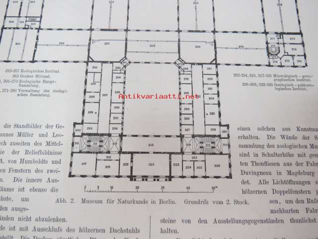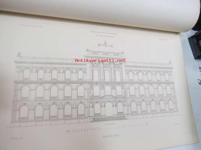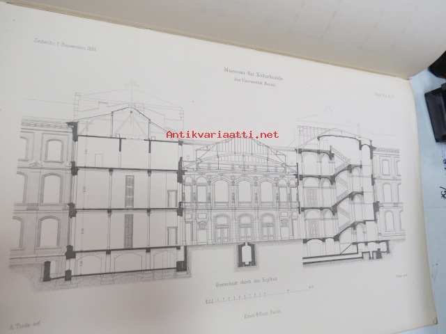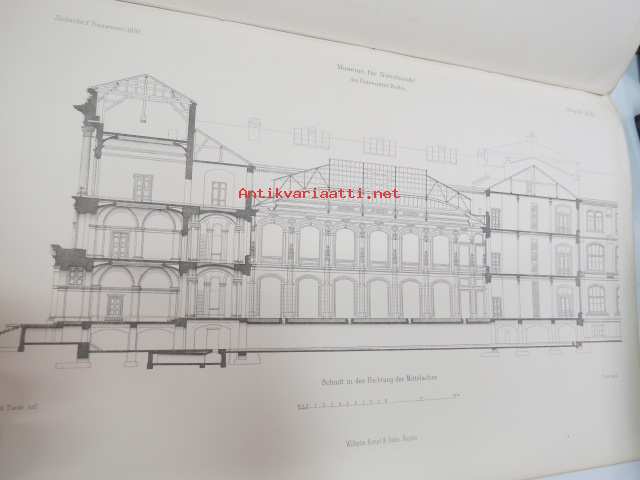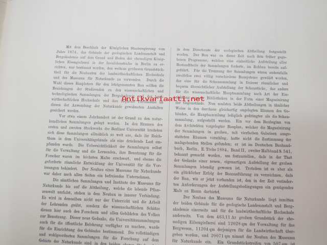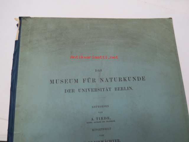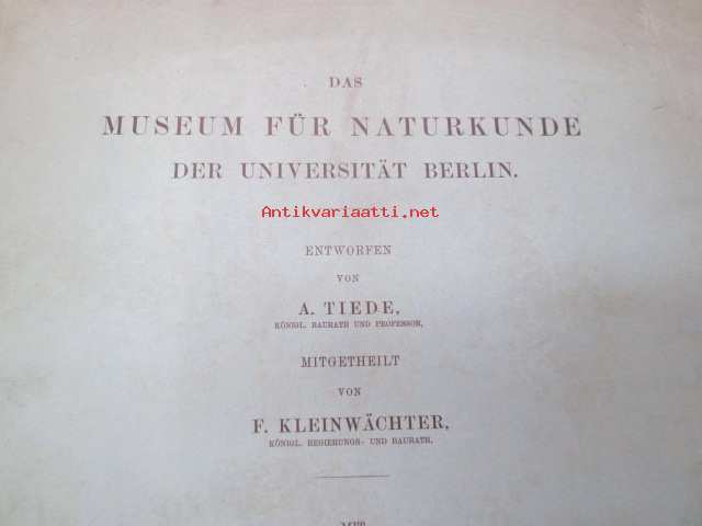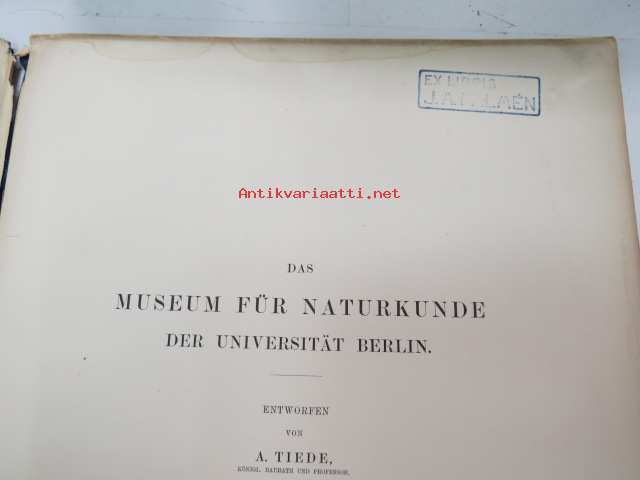 Das Museum für Naturkunde der Universität Berlin - Entworfen von A. Tiede, Mitgtheilt von F. Kleinwächter, Mit Abbildungen in Holzschnitt und 6 Kupfertafeln (sonderdrück aus der Zeitschrift für Bauwesen Jahrgang 1891), ex J.A. Palmén -Berliinin luonnonhistoriallisen museon rakennuksen esittely ja piirustukset / Natural history Museum of Berlin building