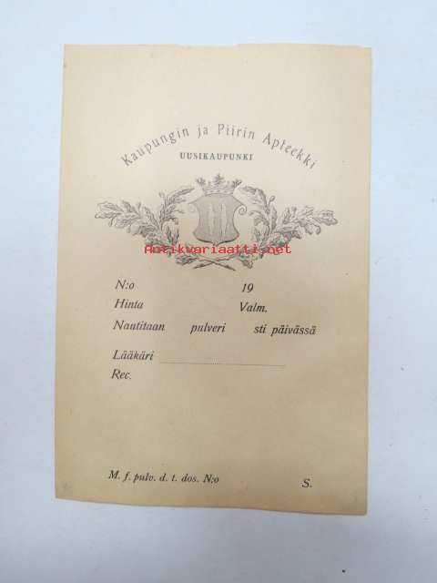 Kaupungin ja Piirin Apteekki Uusikaupunki - apteekkipussi, tyhjä tuotepakkaus