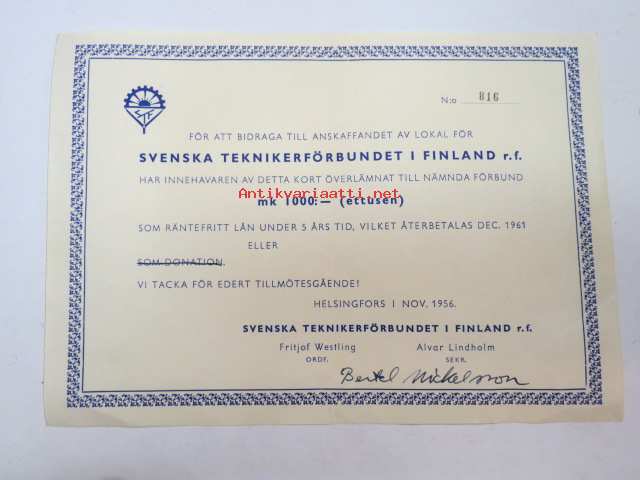 För att bidraga till anskaffandet av lokal för Svenska Teknikerförbundet i Finland r.f. har innehavaren av detta kort överlämnat till nämnda förbund mk 1 000:- (ettusen) som räntefritt lån under 5 års tid, vilket återbetalas dec. 1961 eller donation -korottoman lainan / lahjoituksen kuitti nr 816 -donation - loan receipt