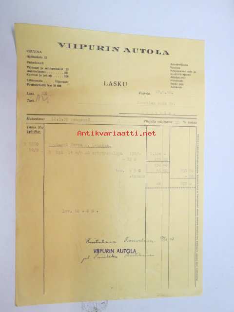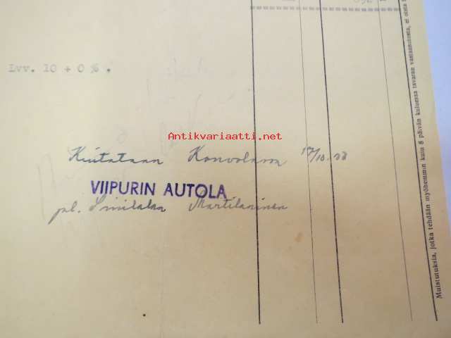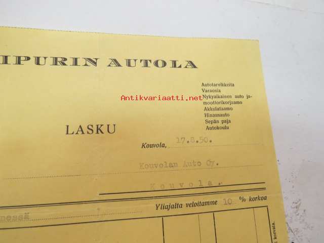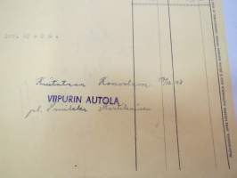Viipurin Autola - Kouvolan Auto Oy 17.8.1950 -lasku / asiakirja -business document