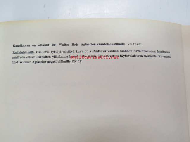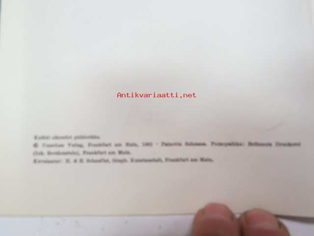 | Saatavilla | 1 kpl | | Julkaisuvuosi | 1961 | | Sivuja | 60 | | Painos | 1. | | Kunto | K2 | | Sidonta/painoasu | Nidottu (pehmeäk.) | | Kielet | Suomi |