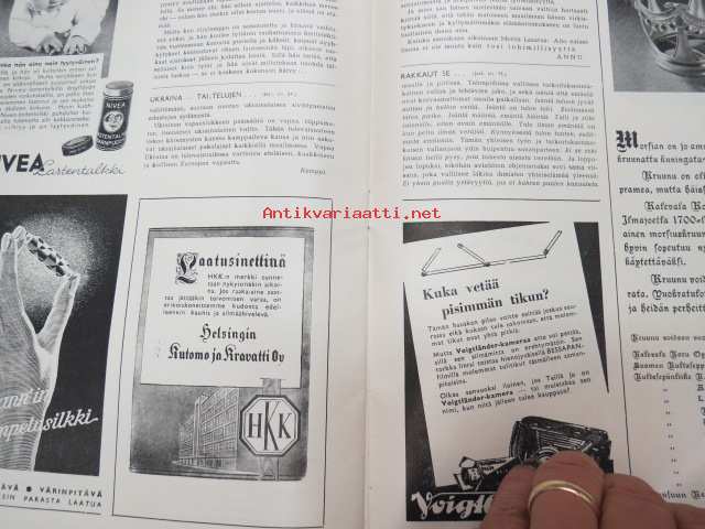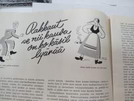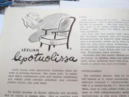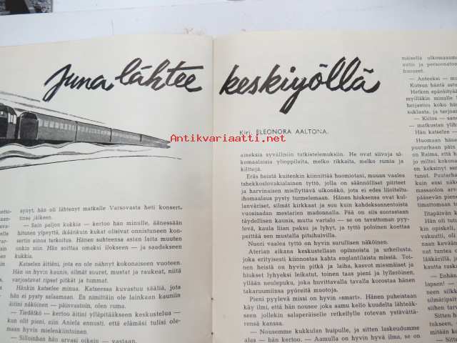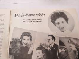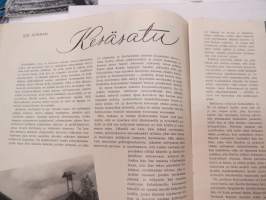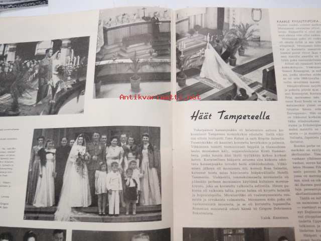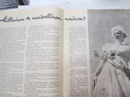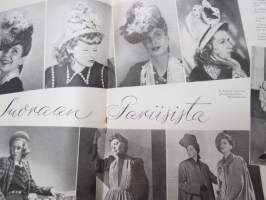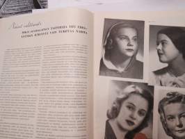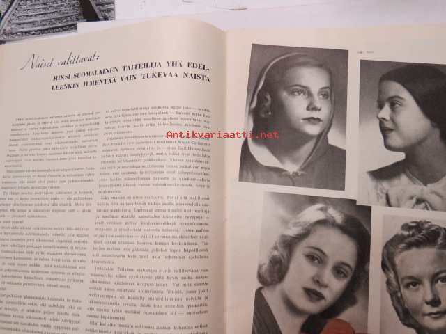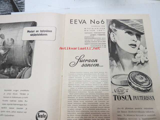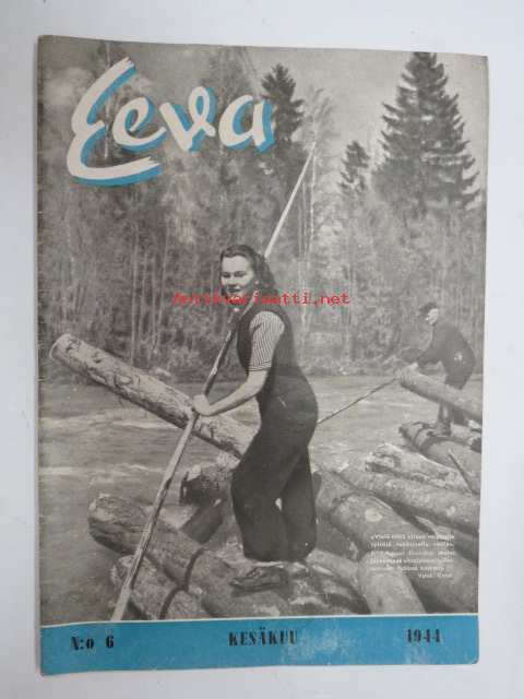 Eeva 1944 nr 6 kesäkuu, sis. mm. seur. artikkelit / kuvat / mainokset; Kansikuva filmitähti Mervi Järventaus uittotyömaalla Vantaanjoen Pitkässä koskessa, Millainen on naisellinen nainen?, Miksi suomalainen taitelilija yhä edelleenkin ilmentää vain tukevaa naista?, Parooni Carl Knuttson Bonde naimisiin suomalaisen Brita Fogelbergin kanssa, Zoe Myrman - Kesäsatu, Suoraan Pariisista, Maria-kampauksia ja tekohiuksia suosii nykyinen hiusmuoti, Eleonora Aaltona - Juna lähtee keskiyöllä, Miklos Akos - Margit unelmoi rikkaudesta, Ukraina - taistelujen kärsimysten ja surun maa - Bohdan von Kentsrschynskij ja hänen suomalainen puolisonsa ym. -monthly magazine for women21 x 30 cm.