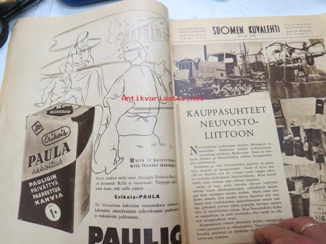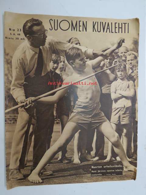 Suomen Kuvalehti 1948 nr 23, ilmestynyt 5.6.1948, sis. mm. seur. artikkelit / kuvat / mainokset; Kansikuva Nuorten urheiluviikolla - "Matti Järvinen opastaa tulevia urheilumestareita", Kauppasuhteet Neuvostoliittoon, Paulig Paula-sekoitus, Siipilaivoista alettiin Päijänteellä, Helsingin rantojen kurjuus, Larin-Kyösti 75 vuotta, Neuvostoliiton raskas teollisuus esittäytyy Messuhallissa, Kun Höytiäinen sai lohia - kalanistutusta, Höyrylaiva "Ahti" (Näsijärvi) valmistui 90 vuotta siten, ym. -weekly magazine