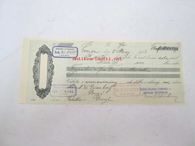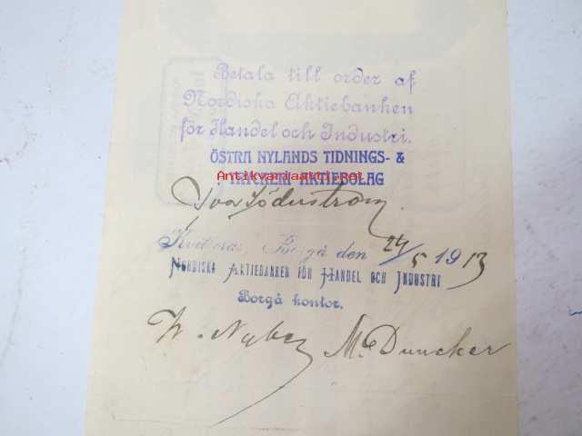 Östra Nylands Tidnings- & Tryckeri Ab / A.W. Granberg Porvoo 8.5.1913 -asiakirja / business document