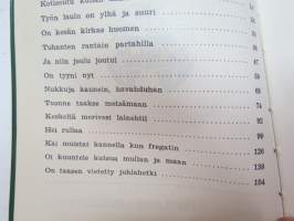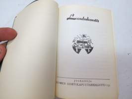 | Saatavilla | 1 kpl | | Julkaisuvuosi | 1961 | | Sivuja | 155 | | Painos | 1. | | Kunto | K3 | | Sidonta/painoasu | Nidottu (pehmeäk.) | | Kielet | Suomi |