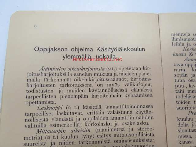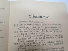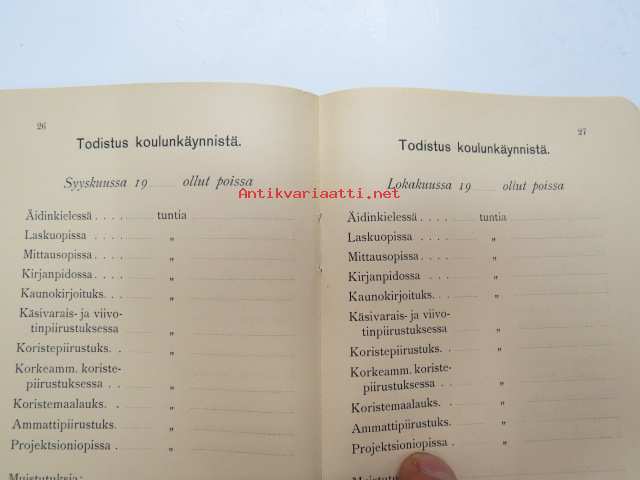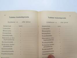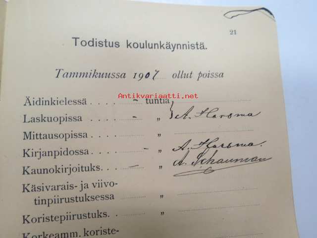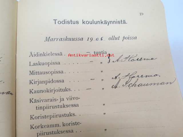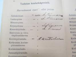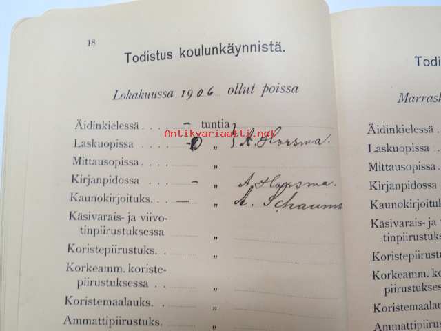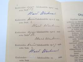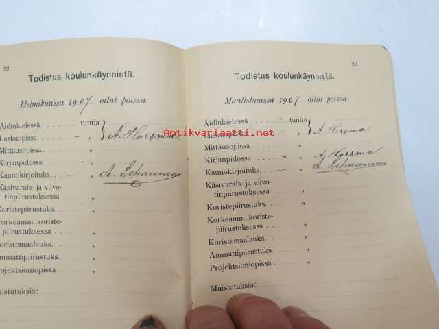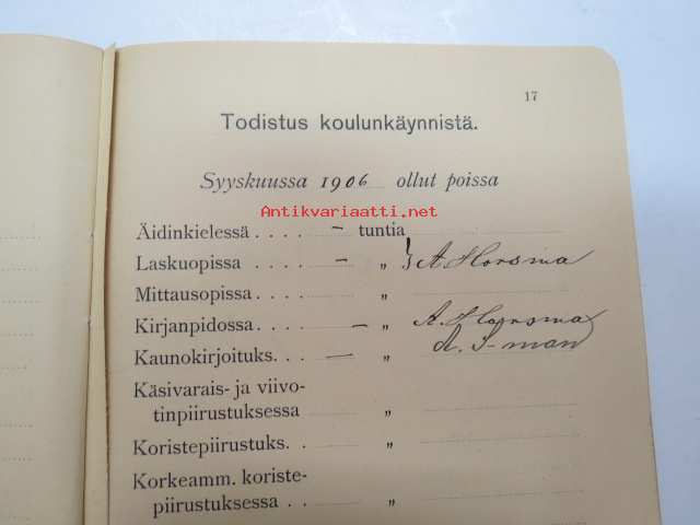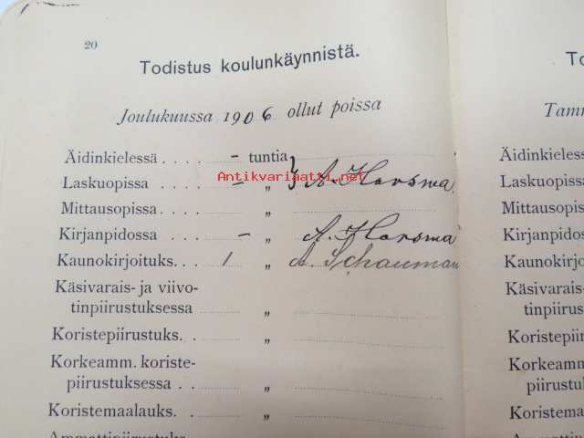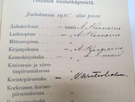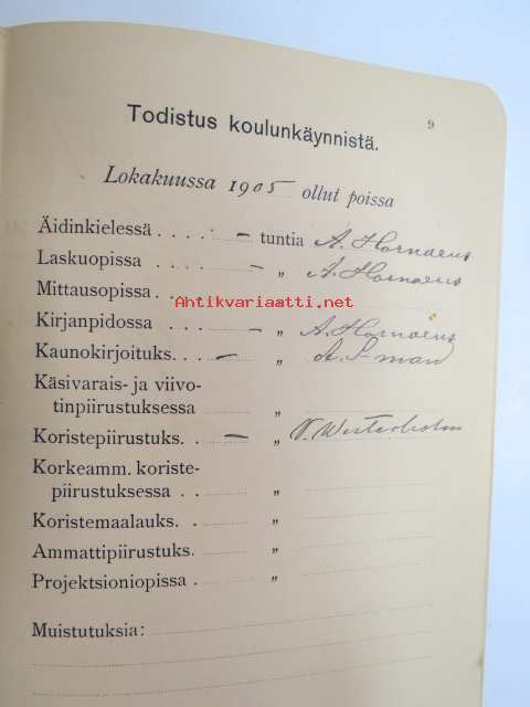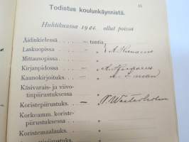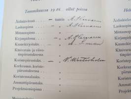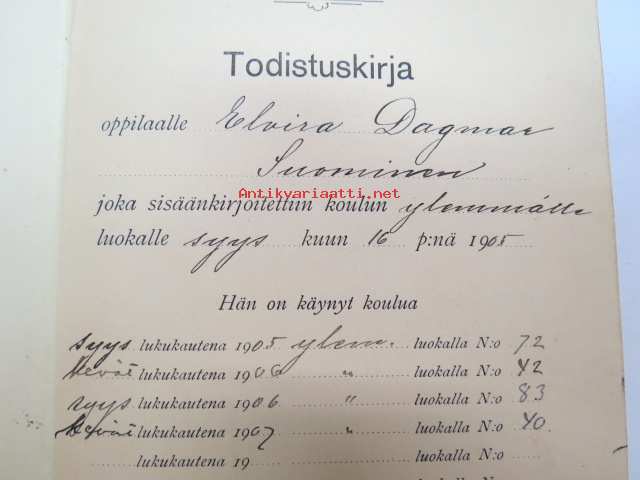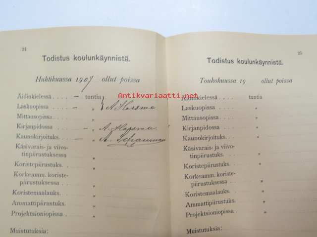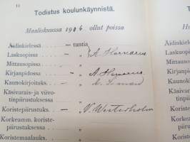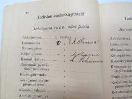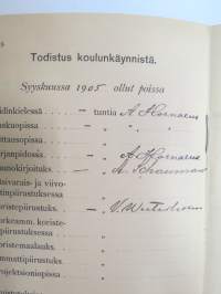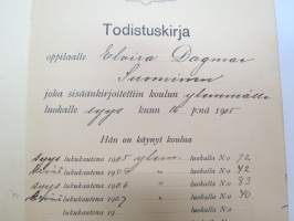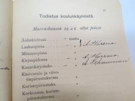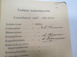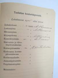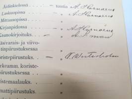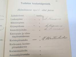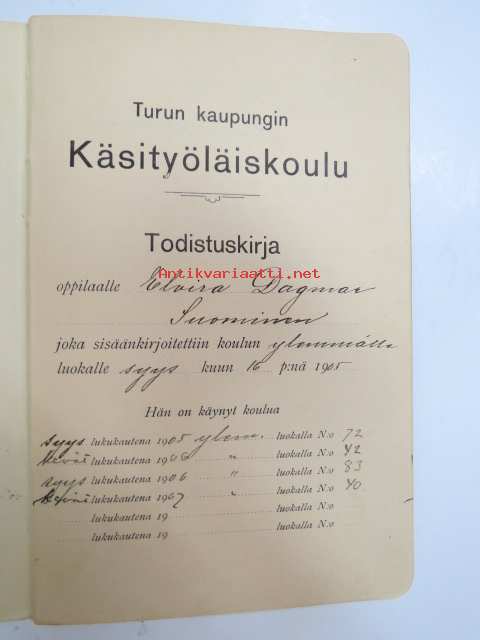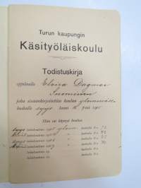 Turun kaupungin Käsityöläiskoulu - Todistuskirja Elvira Dagmar Suominen 1905-1907, sisältää tiedot käydyistä kursseista, niiden tuntimääristä,
