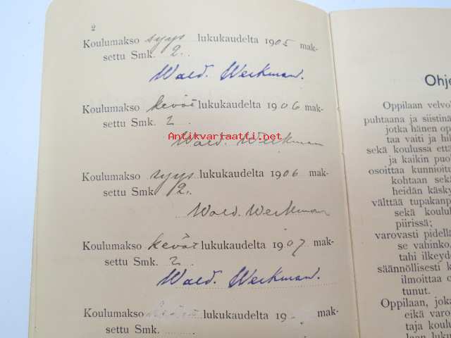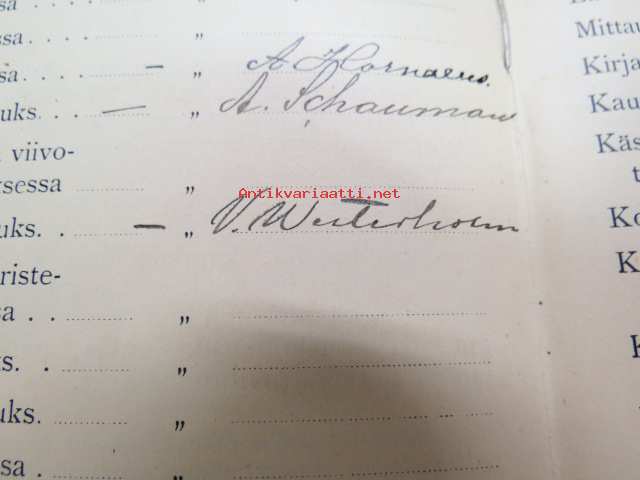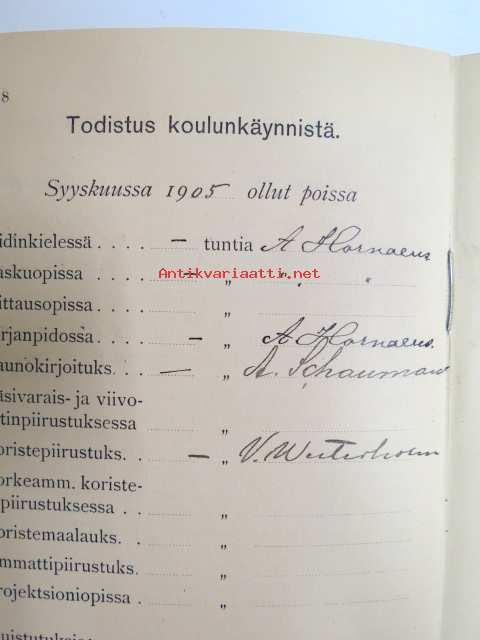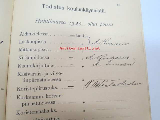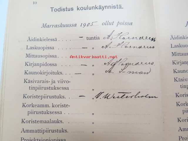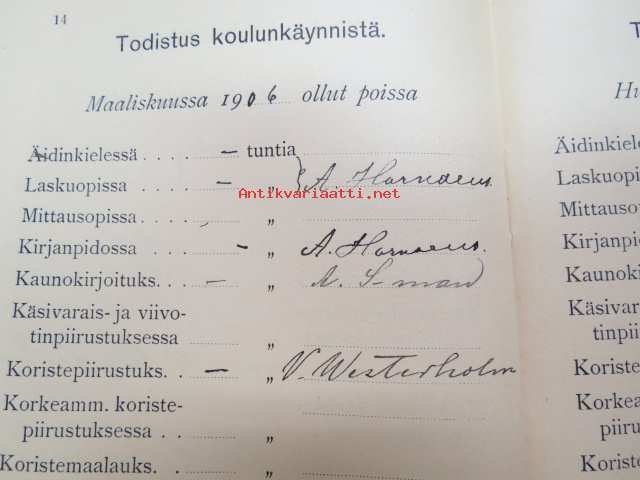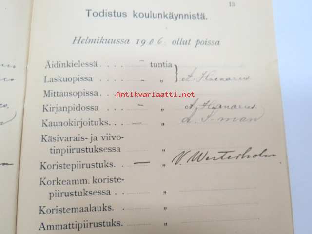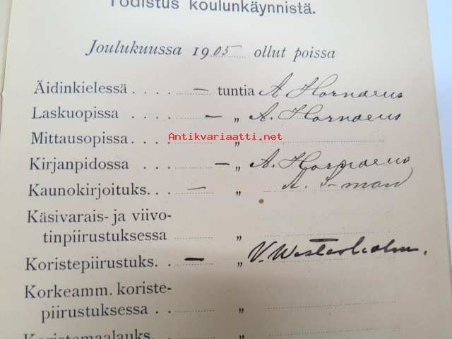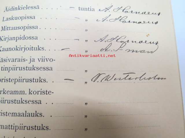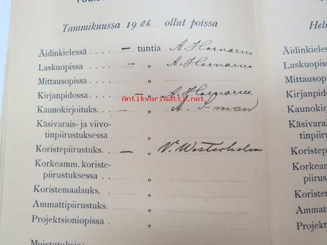 Turun kaupungin Käsityöläiskoulu - Todistuskirja Elvira Dagmar Suominen 1905-1907, sisältää tiedot käydyistä kursseista, niiden tuntimääristä, opettajista yms. - huomionarvoista on, että Koristepiirustuksen opettajana on toiminut Victor Westerholm, kuten muittenkin opettajien, on hänenkin nimensä mustekynällä signeerattuna peräti kahdeksaan eri kohtaan tässä kirjassa - kaikki eri opettajien nimikirjoitukset ovat keskenään erilaisia - eivät yhden henkilön kirjoittamia (katso kuvista esim. A. Hornaeus & A. Schaumann A-kirjaimia, Westerholminkin nimikirjoitus täsmää joihinkin kuvahaulla esiin tuleviin taideteosten signeerauksiin - ei kaikkiin, koska hänenkin nimikirjoituksestaan on olemassa erilaisia variaatioita) -Turku Institute of handirafts - school records book for Miss Elvira Dagmar Suominen, 8 signatures of Victor Westerholm