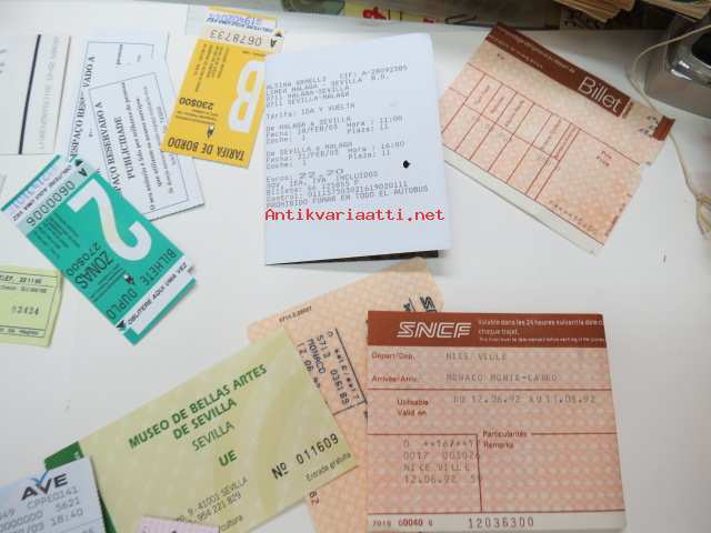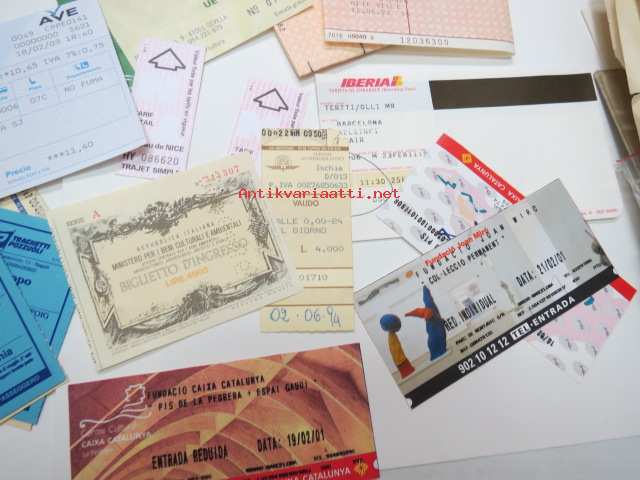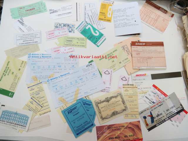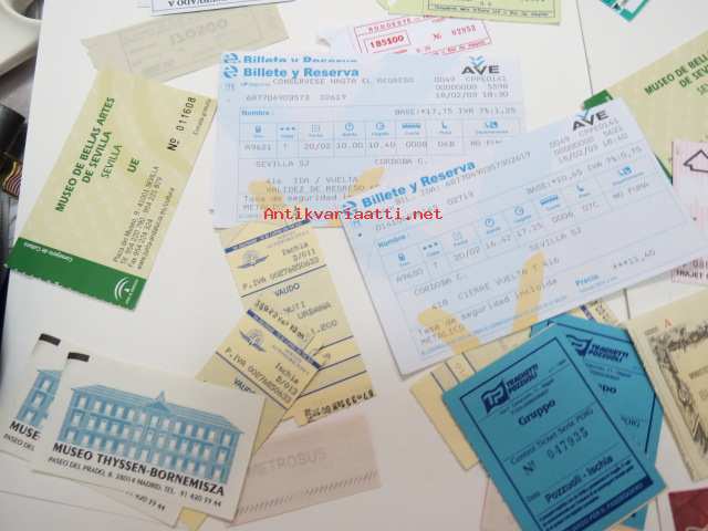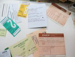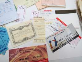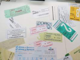 Erä erilaisia ulkomaisia matka- ja pääsylippuja -foreign travel and entrance tickets