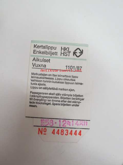 HKL/HST Helsinki 1101/87 Kertalippu - Enkelbilljett nr 4483444 Aikuiset/Vuxna - matkalippu / travel ticket