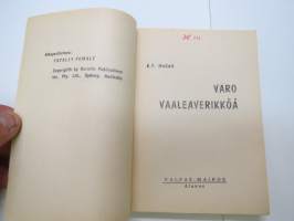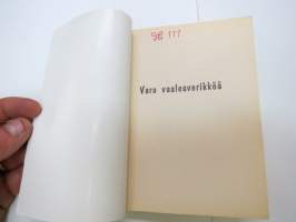| Saatavilla | 1 kpl | | Julkaisuvuosi | 1962 | | Sivuja | 159 | | Painos | 1. | | Kunto | K2 | | Sidonta/painoasu | Nidottu (pehmeäk.) | | Kielet | Suomi |
