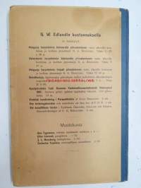 | Saatavilla | 1 kpl | | Julkaisuvuosi | 1906 | | Sivuja | 109 | | Painos | 1. | | Kunto | K2 | | Sidonta/painoasu | Sidottu (kovak.) | | Kielet | Suomi |