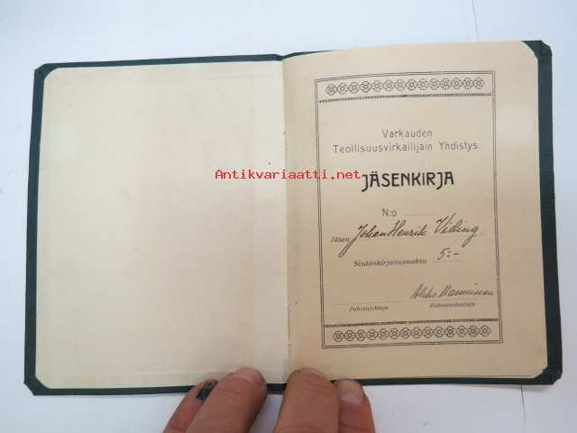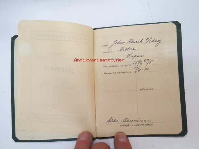 Varkauden Teollisuusvirkailijainyhdistyksen Jäsenkirja J.H. Viding 1931 -membership book