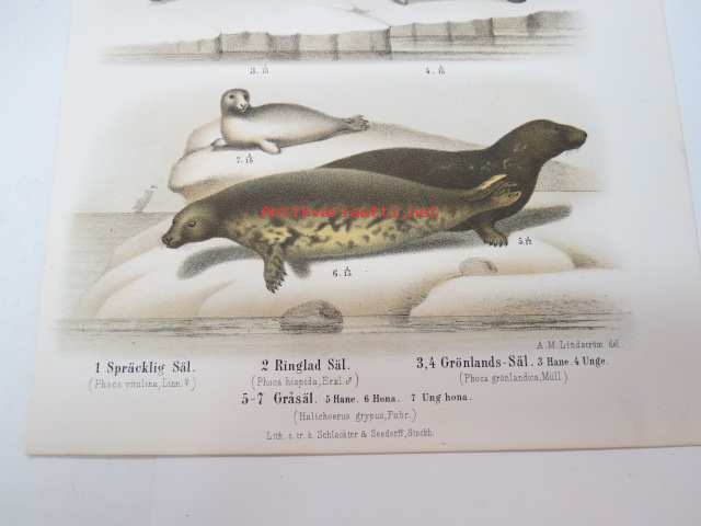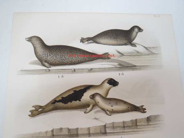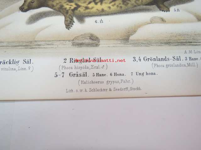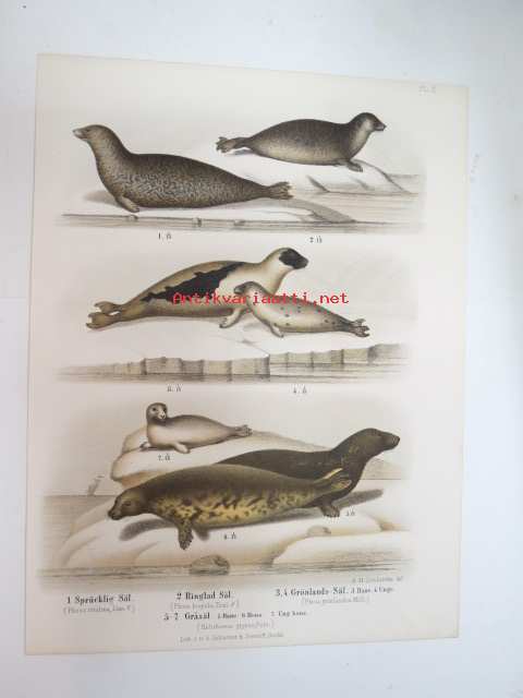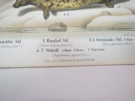 Spräcklig Säl, Ringlad Säl, Gröndals Säl, Gråsäl -painokuva Schlachter & Seedorff, Stockholm, 1873, teoksesta "Atlas öfver Skandinaviens Däggdjur" -print