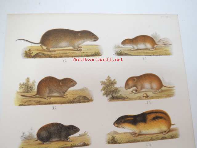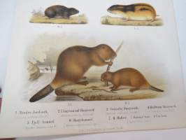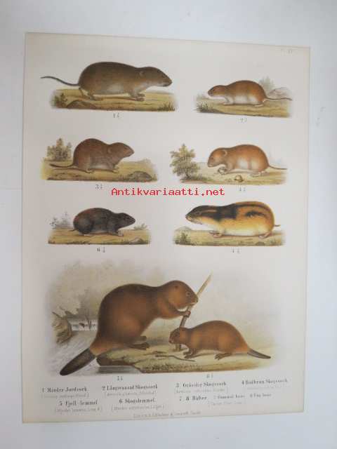 Mindre Jordork, Långsvansad Skogsork, Gråsidig Skogsork, Rödbrun Skogsork, Fjel-lemmel, Skogslemmel, Bäfver / Myyrä, majava -painokuva Schlachter & Seedorff, Stockholm, 1873, teoksesta "Atlas öfver Skandinaviens Däggdjur" -print