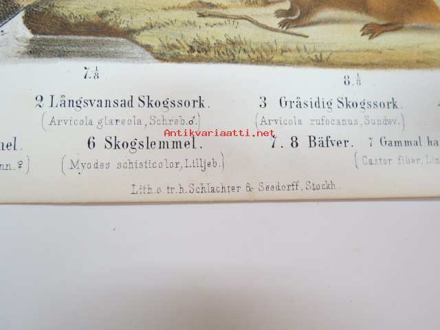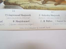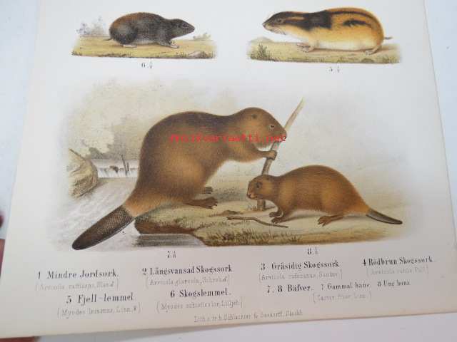 Mindre Jordork, Långsvansad Skogsork, Gråsidig Skogsork, Rödbrun Skogsork, Fjel-lemmel, Skogslemmel, Bäfver / Myyrä, majava -painokuva Schlachter & Seedorff,
