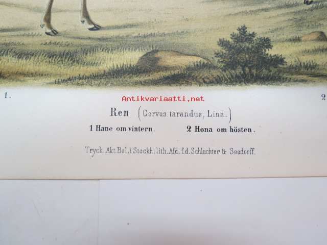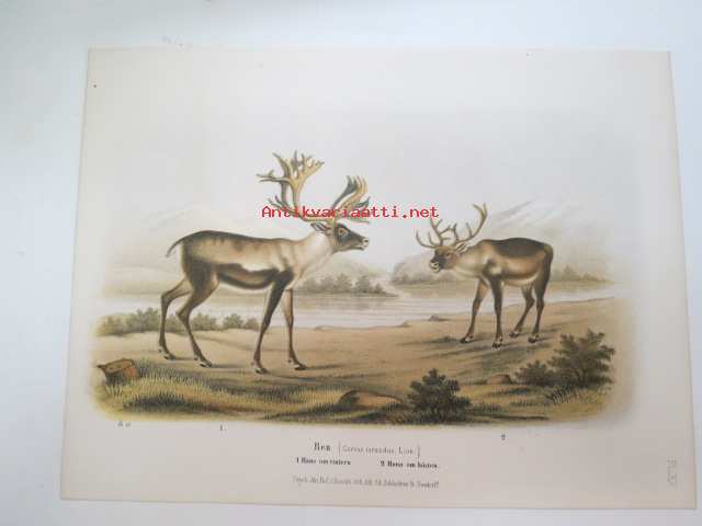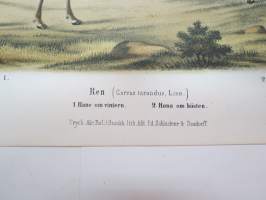 Ren - Poro -painokuva Schlachter & Seedorff, Stockholm, 1873, teoksesta "Atlas öfver Skandinaviens Däggdjur" -print