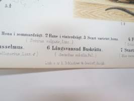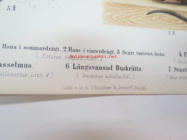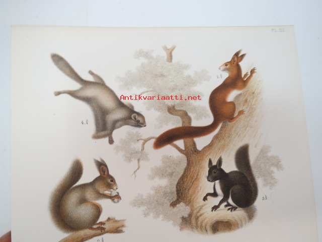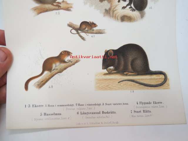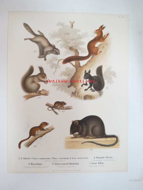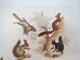 1873Ekorre, Flygande Ekorre, Hasselmus, Långsvansad Buskråtta, Svart Råtta -painokuva Schlachter & Seedorff, Stockholm, 1873, teoksesta "Atlas öfver Skandinaviens Däggdjur" -print