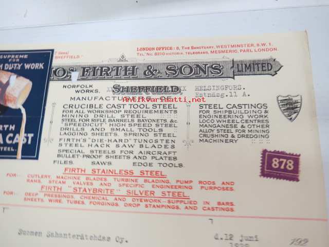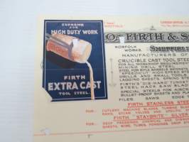 Thomas Firth & Sons Limited, Sheffield / Helsingfors, 12.6.1929 - Suomen Sahanterätehdas Oy, Tampere -asiakirja - Firth Extra Cast Tool Steel -mainosmerkki