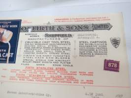 Thomas Firth & Sons Limited, Sheffield / Helsingfors, 12.6.1929 - Suomen Sahanterätehdas Oy, Tampere -asiakirja - Firth Extra Cast Tool Steel -mainosmerkki liimattuna -business document